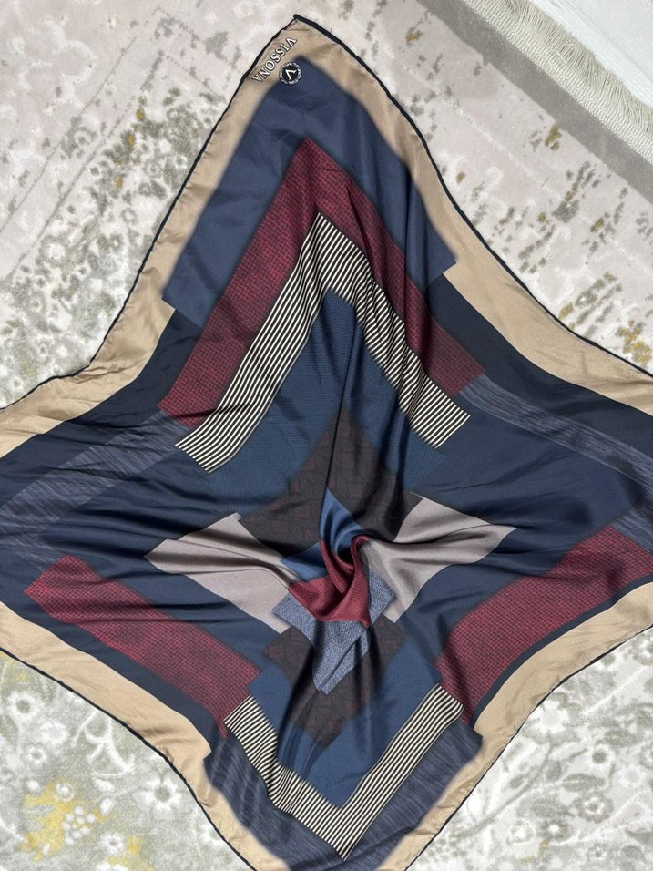 Kadınlar için çok renkli, geometrik desenli ve dökümlü fular. Yumuşak sentetik kumaştan, bohem ve retro tarzlara uygundur.