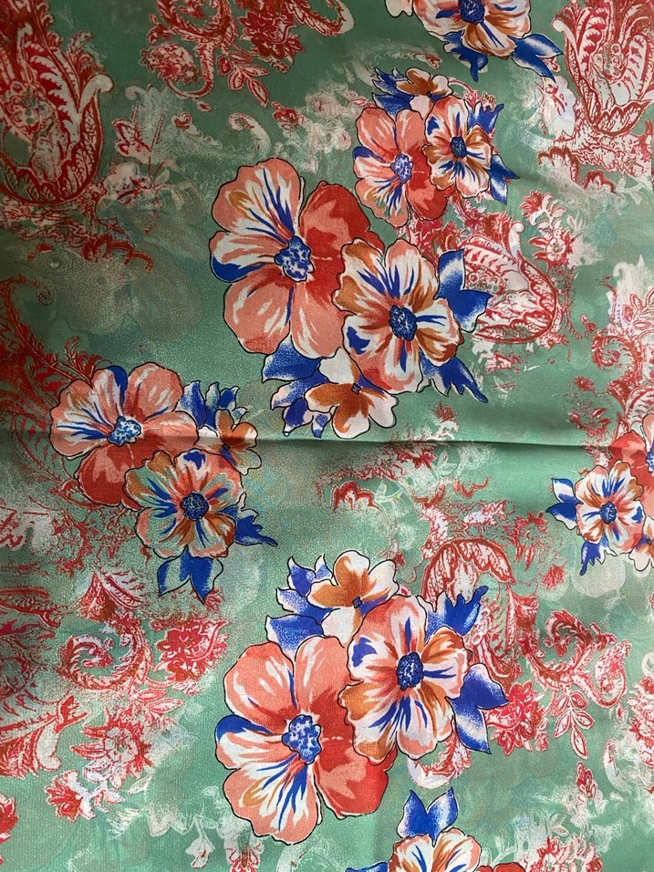 Kadın fular, yumuşak sentetik kumaş üzerine çok renkli pastel çiçek desenleriyle bohem ve vintage tarzını yansıtıyor. Sayılı kullanıldı. Boyu :175 cm, eni: 68 cm.