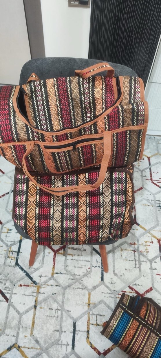 Bohem tarzı, koyu çok renkli çizgili desenli, tokalı kadın plaj çantası. Sentetik kumaştan, günlük kullanıma uygun.