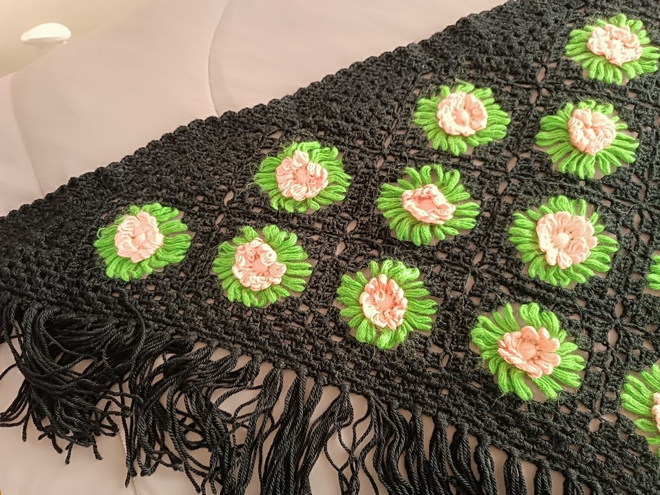 Bohem tarzda, koyu çok renkli iplikten örülmüş kadın şalı. Çiçek desenleri ve püskül detayları içerir.