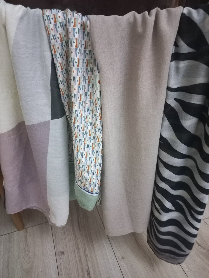 Kadın şalı, gri ve çok renkli dokuma kumaştan, bohem tarzda ve drapeli şekilde tasarlanmıştır. Rahat, retro ve hippie havası taşıyan şal.