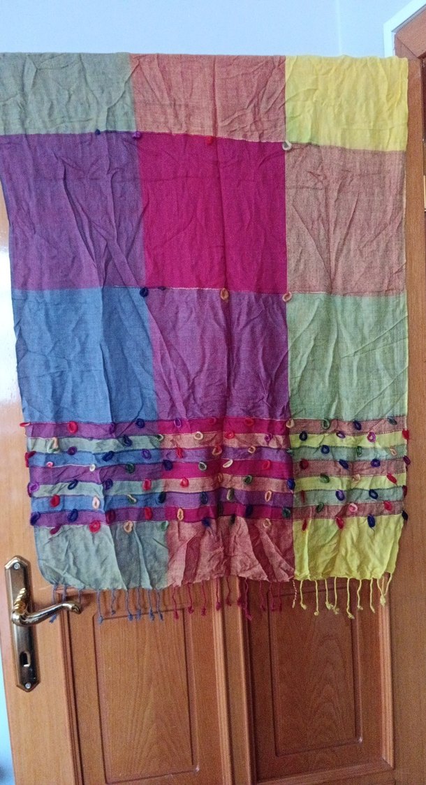 Kadın şalı, pastel çok renkli tekstil, drapeli tasarım ve dekoratif deniz kabuğu detaylarına sahip, bohem tarzını yansıtıyor.