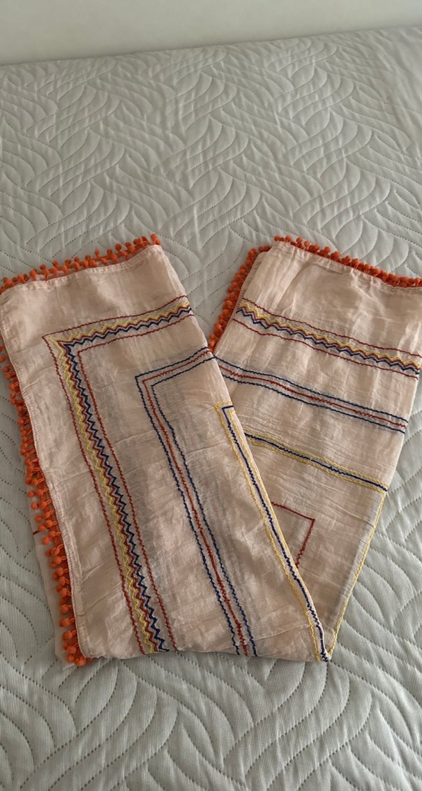Hafif dokulu, çok renkli nakışlı desenlere ve turuncu püsküllere sahip bohem tarzı örtü