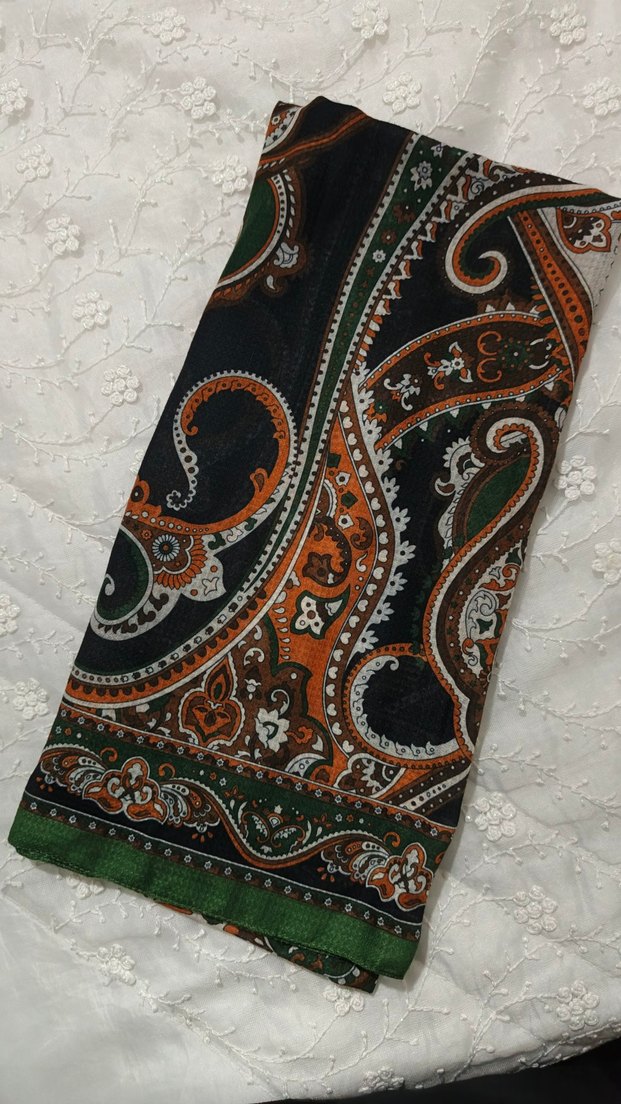 Kadın şal, koyu çok renkli paisley desenli, dökümlü tarzda, yumuşak sentetik kumaştan, bohem havası taşıyor. tertemizler ikili fiyattır marka temsilidir teklif gönderebilirsiniz