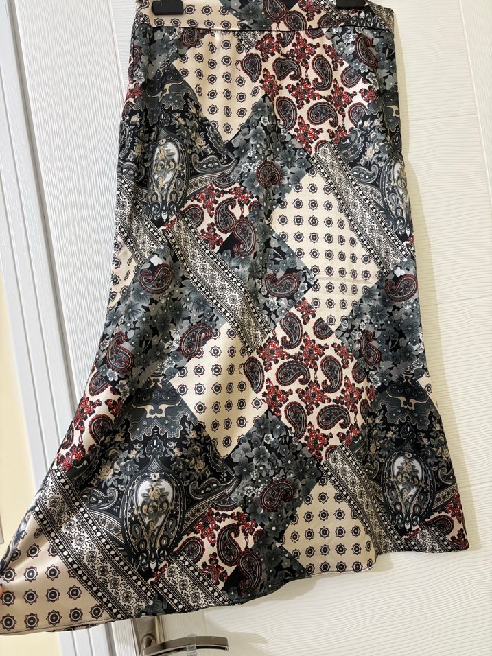 Kadın şalı, yumuşak sentetik kumaş üzerinde koyu çok renkli bohem desenlere ve drapeli bir tasarıma sahiptir. İpek saten özel kumaştır.yandan gizli fermuarlı özel dikimdir 38-40 bedene kadar olur tabi vücut tipiniz çok dolgun değilse 40 bedende rahat giyer