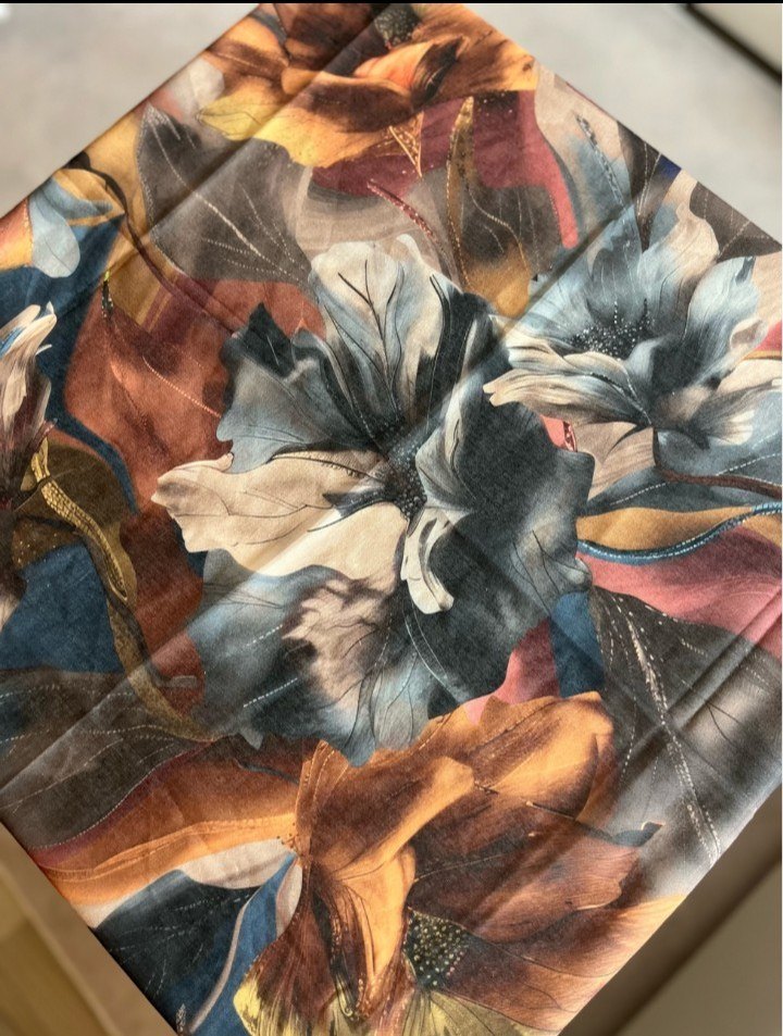 Bu koyu çok renkli kadın şalı, bohem çiçek desenli drapeli bir stile sahiptir ve toprak tonlarıyla retro bir görünüm sunar.