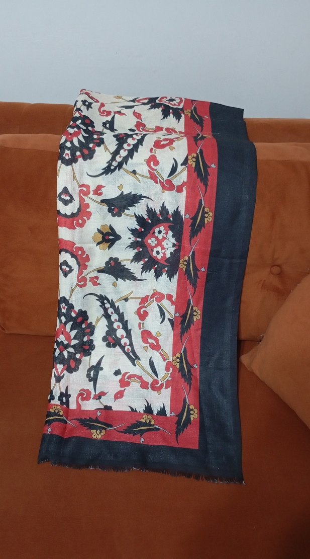 Bohem tarzda, çok renkli desenlere sahip, sentetik kumaştan drapeli kadın şalı.