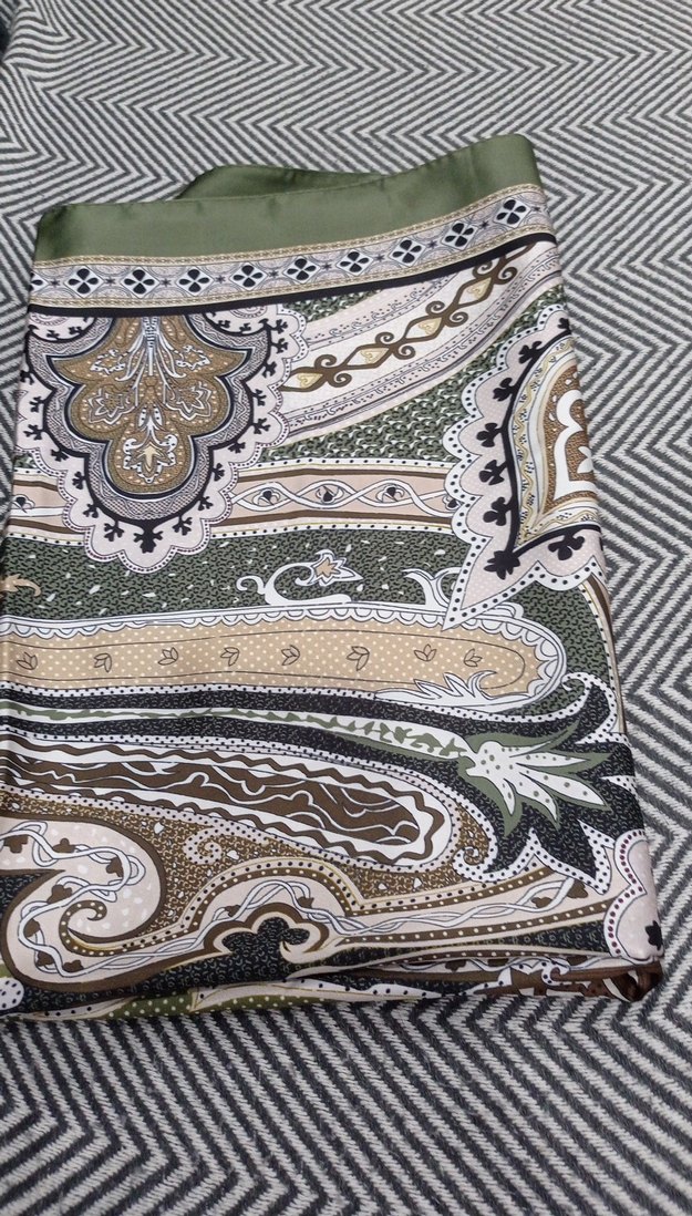 Kadınlar için bohem tarzda, çok renkli desenli, sentetik kumaştan drapeli şal. Gri ve toprak tonlarıyla retro bir havası var.