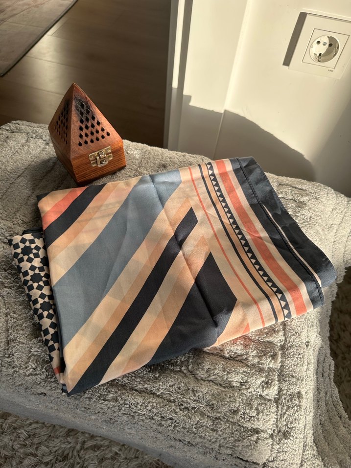 Bohem tarzda, çok renkli desenli, yumuşak sentetik kumaştan kadın şalı. Gri ve sıcak tonlarıyla retro bir görünüm sunar.