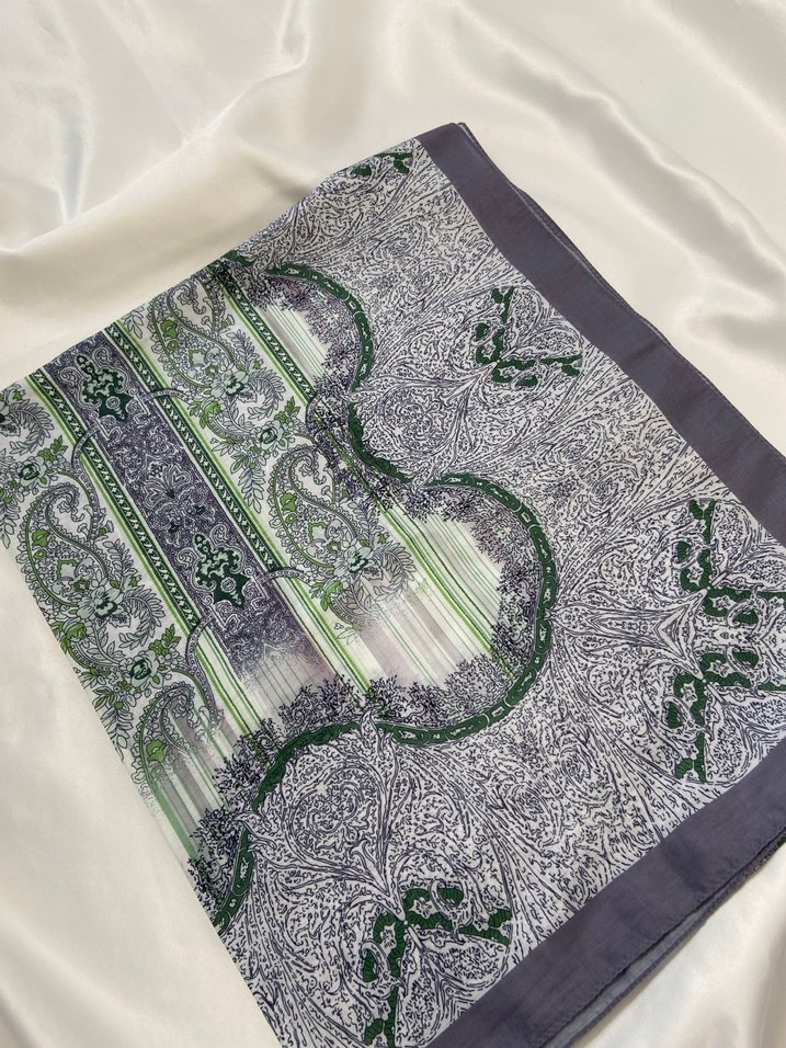 Kadınlar için çok renkli, bohem desenli, gri ve yeşil tonlarda drapeli şal. Yumuşak sentetik kumaştan üretilmiştir.