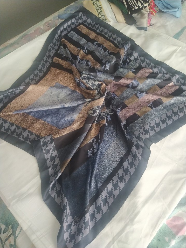 Kadınlar için çok renkli, gri tonlarında ve dökümlü tasarıma sahip sentetik kumaştan yapılmış bohem şal.