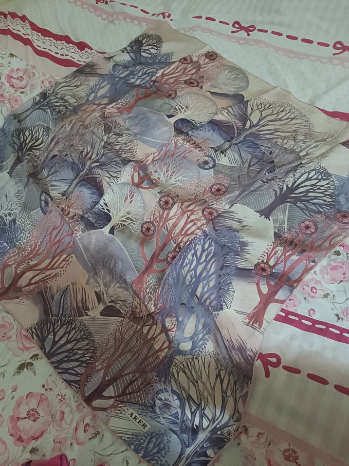 Kadın şalı, pastel çok renkli tekstil üzerinde bohem ağaç desenleriyle drapeli tasarıma sahiptir.