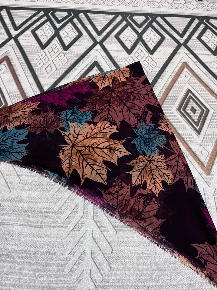 Kadın şalı, yumuşak sentetik kumaştan yapılmış çok renkli yaprak desenli ve drapeli bohem tarzda tasarlanmıştır. Ürün hiç kullanılmamıştır