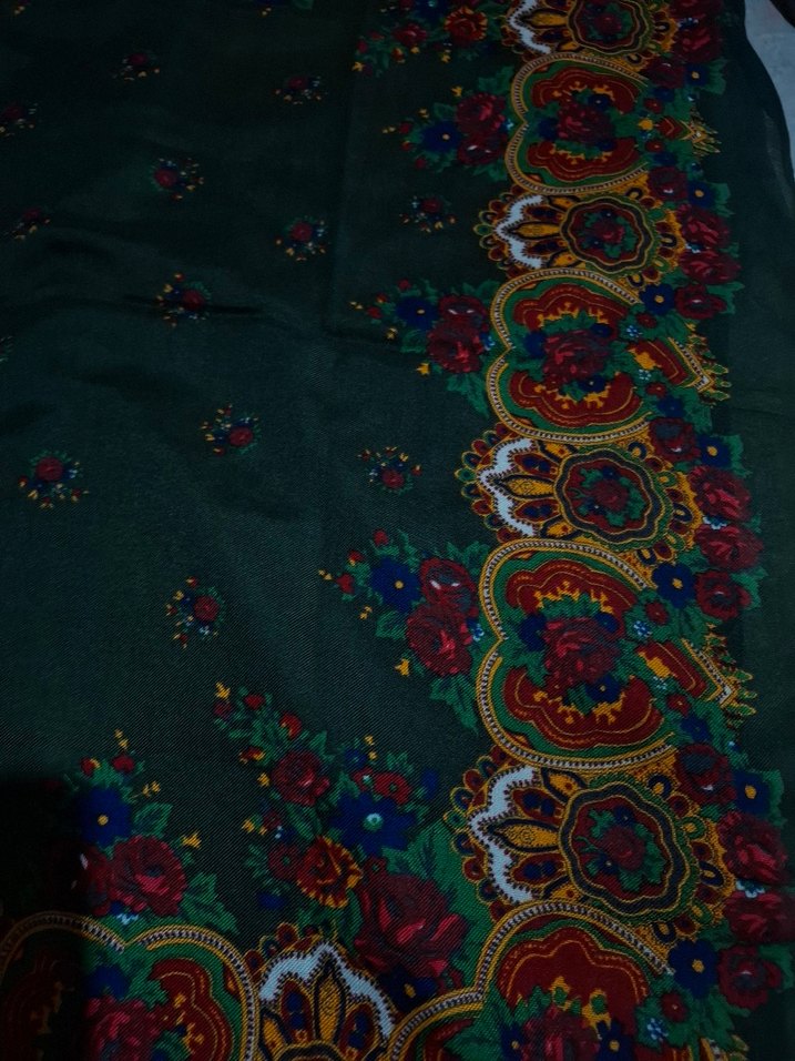Kadın şalı, sentetik kumaş üzerine çok renkli koyu çiçek desenleri ve bohem tarzıyla dikkat çekiyor.