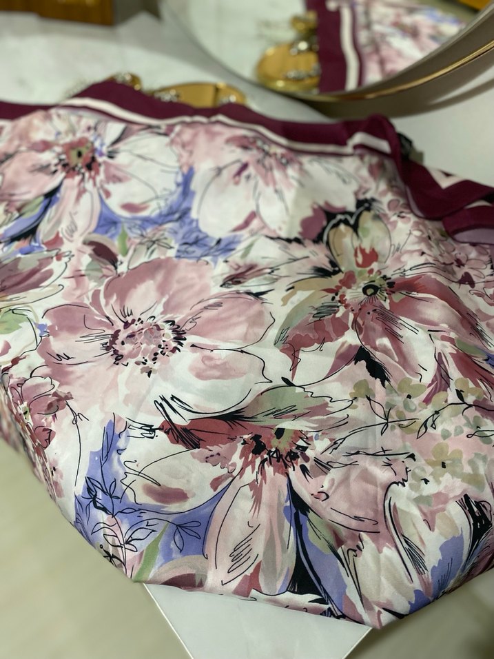 Kadın şal, yumuşak sentetik kumaş üzerine çok renkli pastel çiçek desenli, drapeli tasarıma sahip, bohem tarz için uygun.