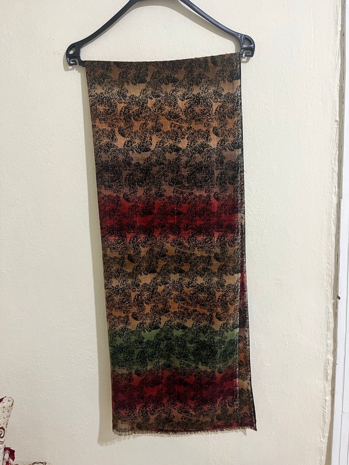 Bohem tarzda, çok renkli desenlere sahip, sentetik yumuşak kumaştan drapeli kadın şalı.