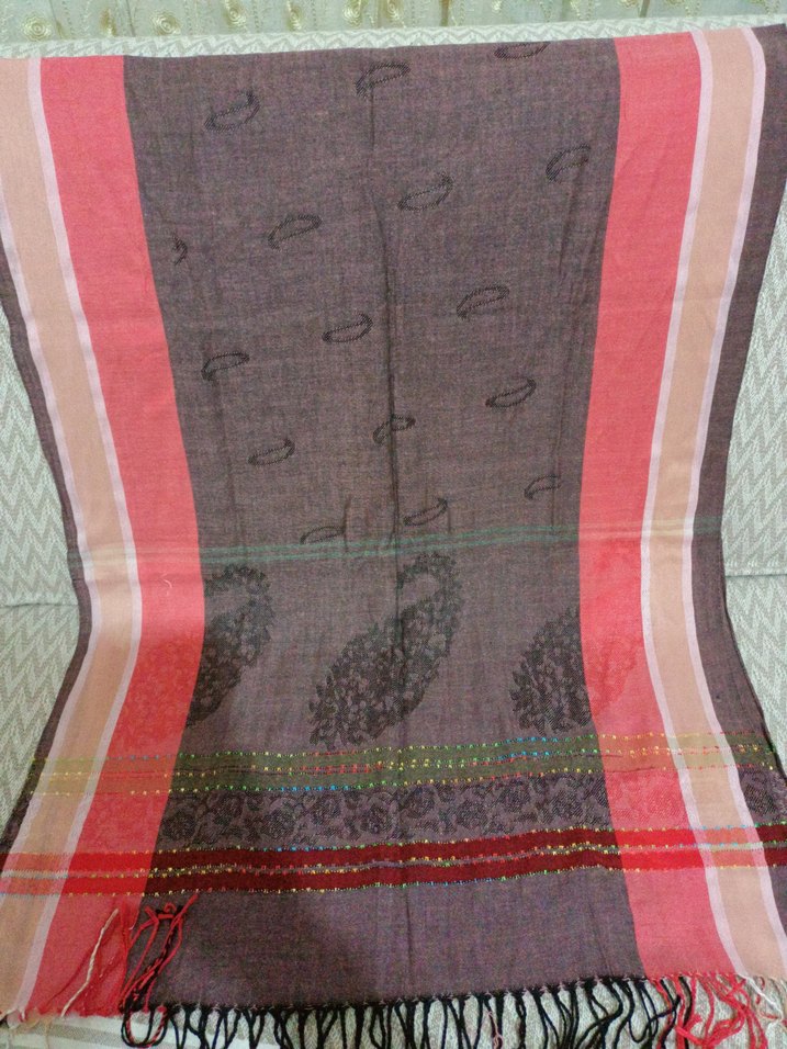 Kadınlar için çok renkli, dokuma kumaştan, drapeli bohem tarzda şal. Gri tonları ve püsküllü kenarlarıyla dikkat çeker.