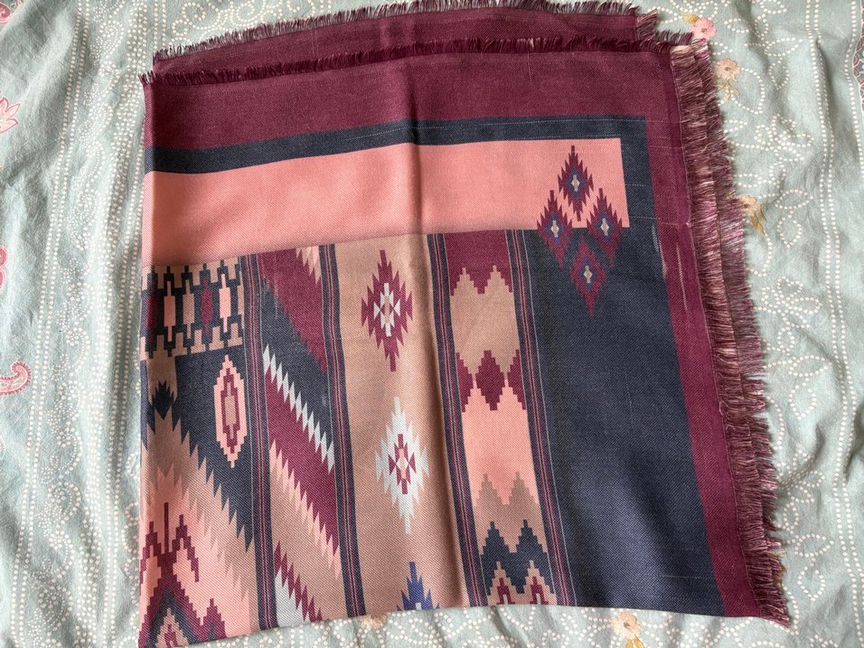 Kadın şalı, çok renkli bohem desenli ve koyu tonlarda drapeli bir tasarıma sahiptir. Yumuşak tekstil kumaştan yapılmıştır ve retro ile hippie stillerini yansıtır.