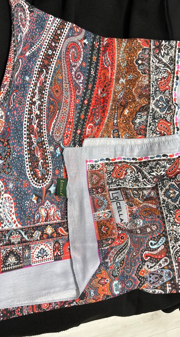 Çok renkli desenlere sahip bohem tarzında kadın şalı, gri kenarlıklı ve fermuarlı detaylıdır.