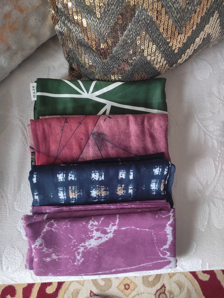 Drapeli, çok renkli ve koyu tonlarda, farklı desenlere sahip dört adet bohem tarzı kadın şal seti.