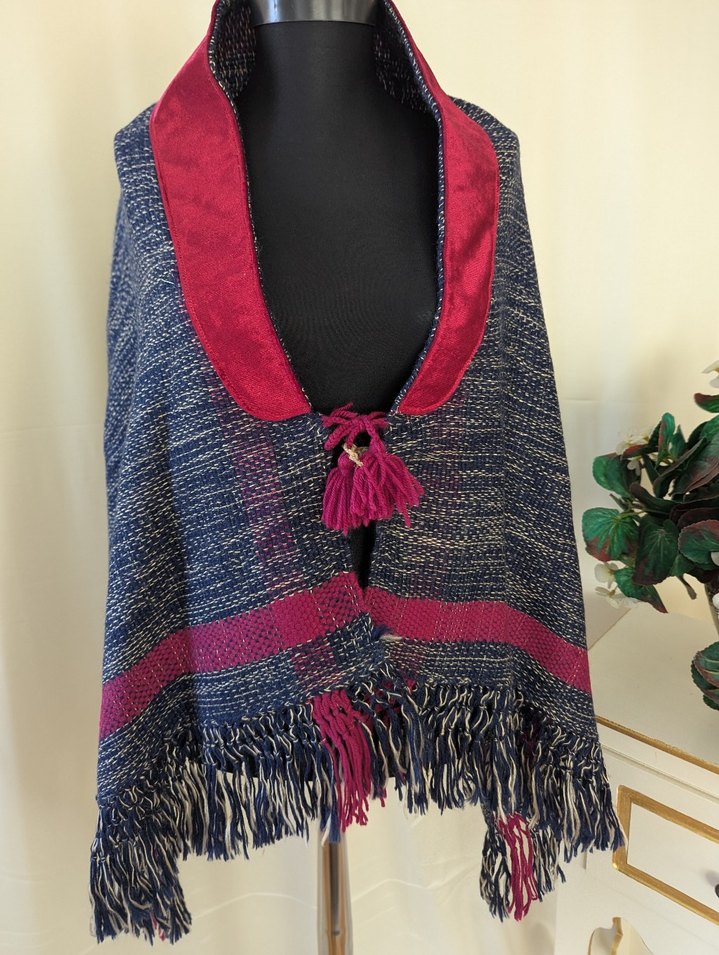 Kadınlar için çok renkli, triko dokulu, gri ve kırmızı detaylı bohem tarzda panço.Püsküllu. bağlama detaylarıyla retro havasında. Yöresel dokuma.Arka yükseklik 65 cm.