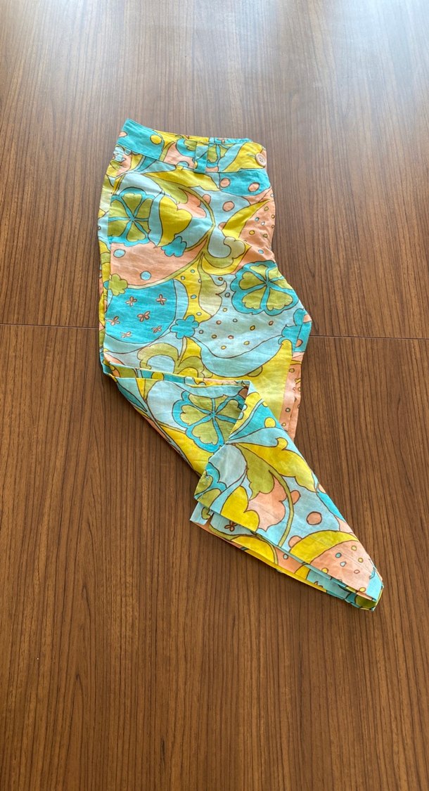 Pastel tonlarda çok renkli batik desenli, dökümlü keten kapri pantolon. Rahat kesimi ile günlük kullanıma uygundur.