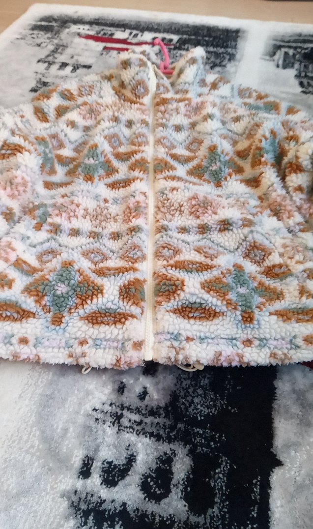 Kapüşonlu, bol kesim kız çocuk ceketi, pastel tonlarda batik desenli ve yumuşak kürk dokusuyla detaylandırılmıştır.