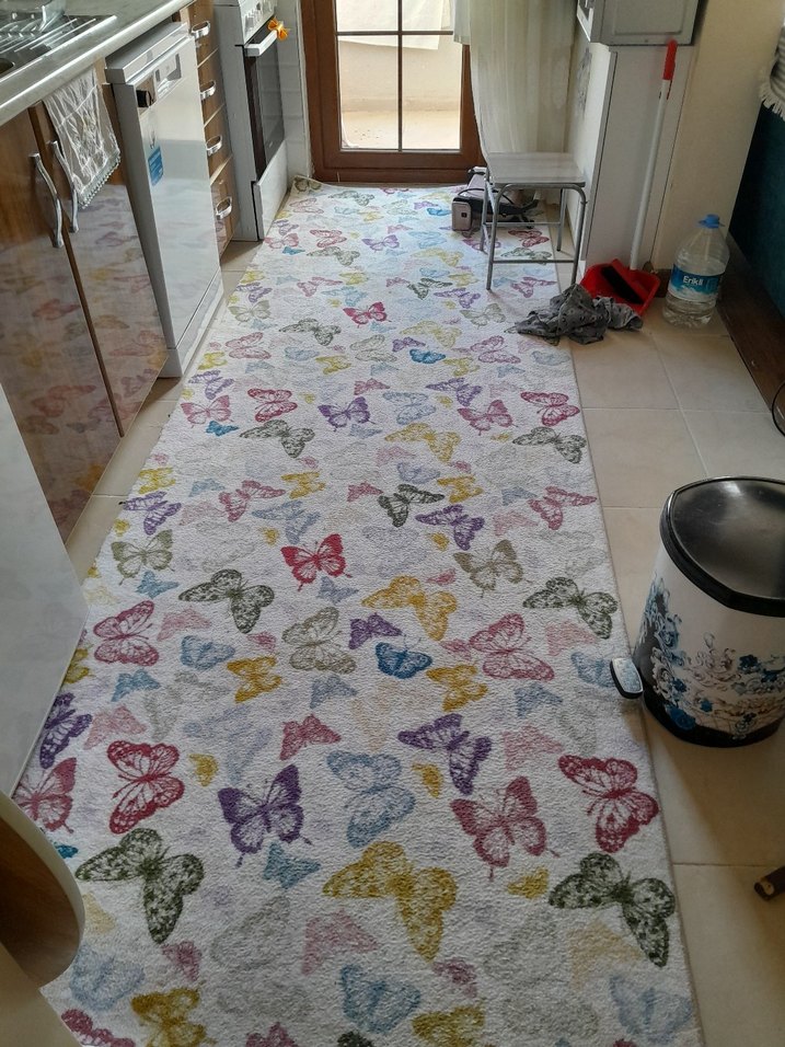 Bohem tarzda, çok renkli kelebek desenli, hafif renklerde bir halıdır. bir kenarı overlok istiyor