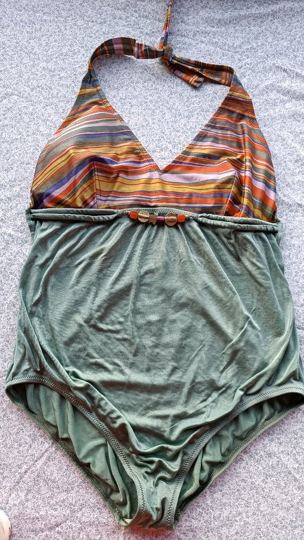 Kolsuz, kemerli, çok renkli çizgili üst ve gri alt parçalı, bohem tarzda, midi boy, vücuda oturan mayo. ️
