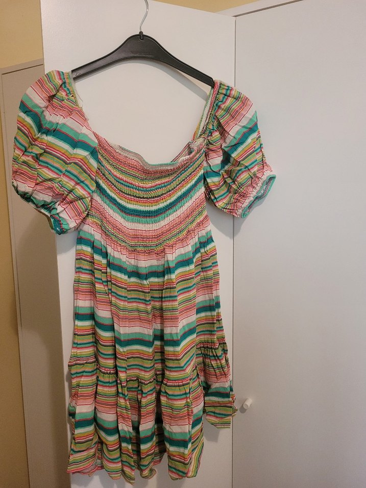 Bohem tarzda, bol kesim ve pileli detaylı, pastel çok renkli çizgili elbise. Tekstil kumaştan, tekne yaka ve balon kolludur, gündelik kullanım için uygundur.
