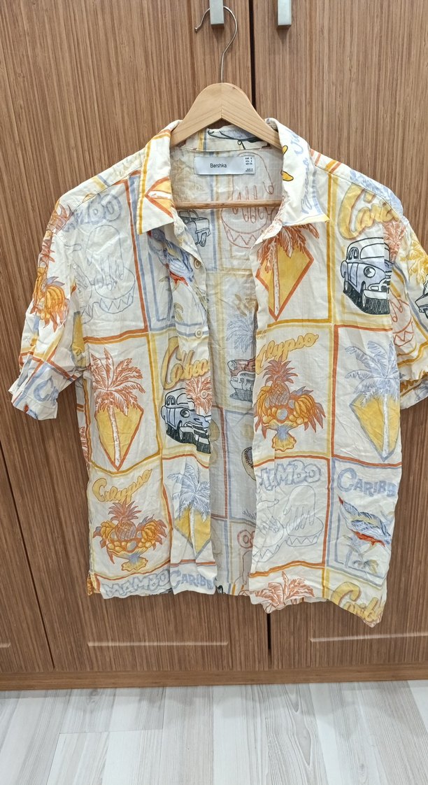 S beden Pamuklu, bol kesim, kısa kollu erkek gömleği. Düğmeli, yakalı ve vintage desenli çok renkli tasarım. Günlük kullanıma uygun.