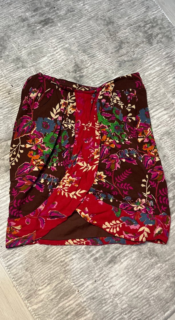 Bohem tarzda, bol kesim, koyu çok renkli çiçek desenli, dokuma kumaştan yapılmış, drapeli kısa mini etek. Günlük kullanıma uygundur.