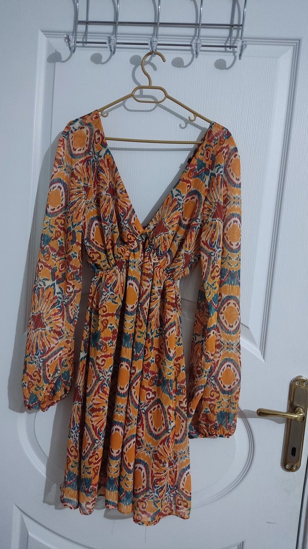 Bohem tarzı çok renkli tie-dye desenli, V yakalı ve bol kesim uzun elbise. Drapeli detaylar ve uzun kollara sahip, yumuşak sentetik kumaştan üretilmiştir.