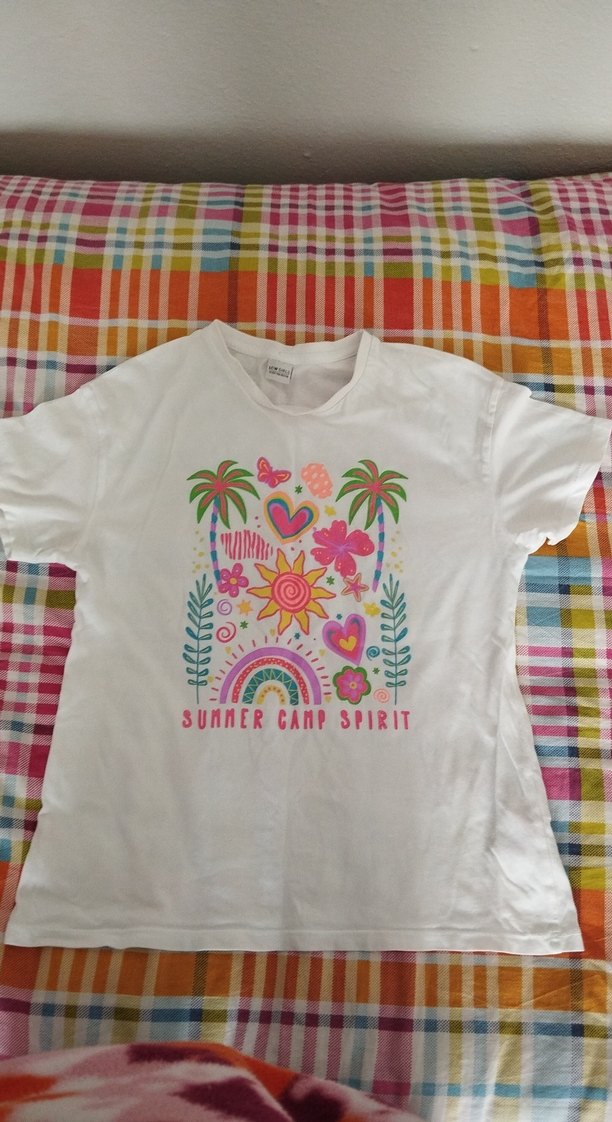 Pamuklu, kısa kollu, bol kesim kız tişörtü. Önünde palmiye ağaçları, kalpler, çiçekler ve gökkuşağı desenli çok renkli bohem baskı bulunur. "Summer Camp Spirit" yazılıdır.