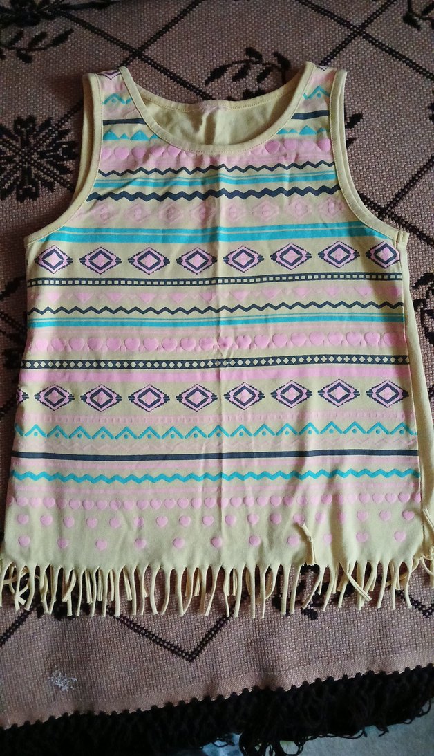 Bohem tarzda, çok renkli pastel örgü kız yeleği. Bisiklet yaka, kolsuz ve püsküllü, bol kesim.