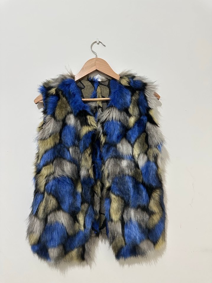 Bohem tarzda, çok renkli tie-dye desenli, sentetik kumaştan yapılmış, kürk detaylı, normal boyda, kolsuz ve yaka detaylı kadın yelek.