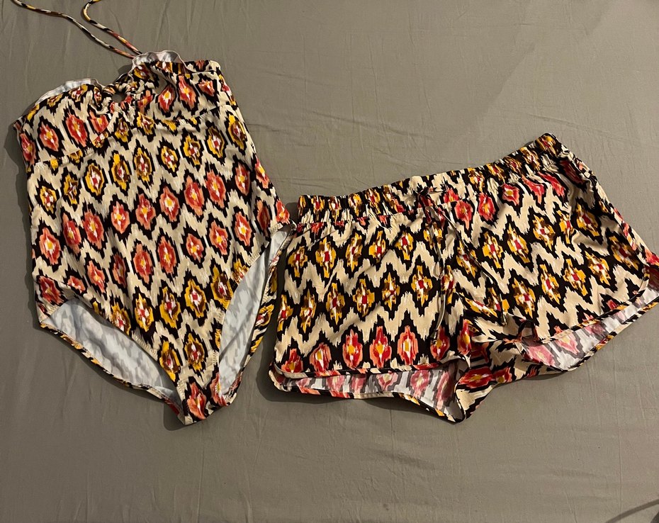 Yumuşak dokulu tekstil kumaştan, bohem çok renkli koyu tie-dye desenli, mayo ve deniz şortu. Mayo 2-3 saat olmak üzere 1 kere havuzda kullanıldı. Şort hiç giyilmedi