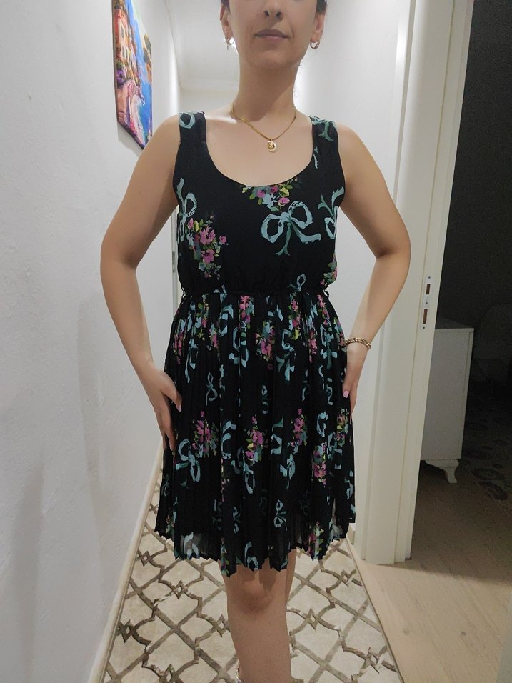 Askılı, bol kesim midi elbise, pileli detaylı ve koyu çok renkli batik desene sahip, rahat ve şık bir seçenek.
