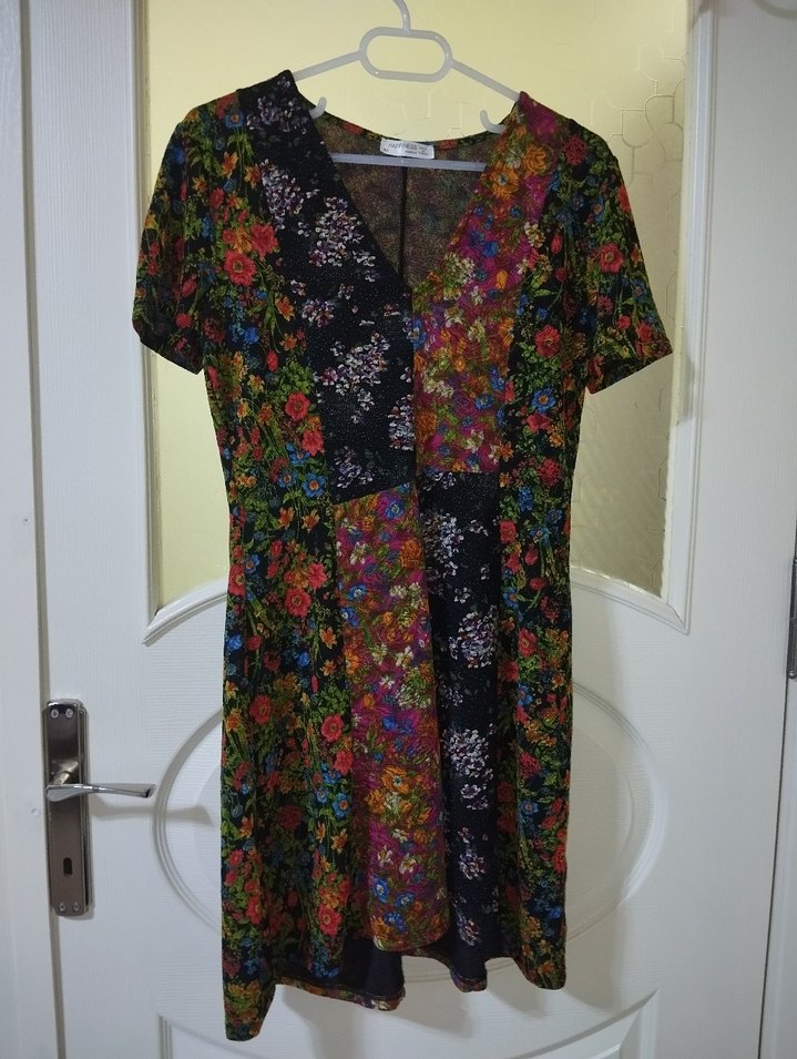 Bohem tarzı çok renkli midi elbise, kısa kollu ve V yakalıdır. Rahat kesimli, drapeli ve yumuşak kumaştan üretilmiştir. Günlük kullanım için uygundur.