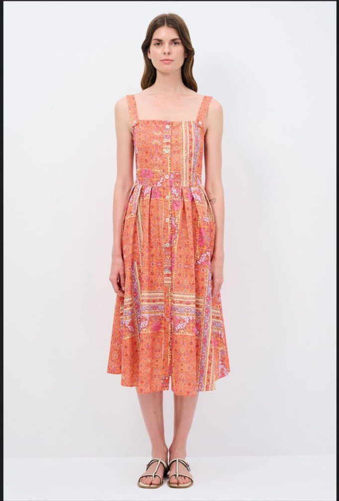 Kolsuz, bol kesim, pile detaylı bohem çok renkli midi elbise. Yumuşak sentetik kumaştan, kare yakalı ve önden düğmeli, romantik akşamlar için uygun.