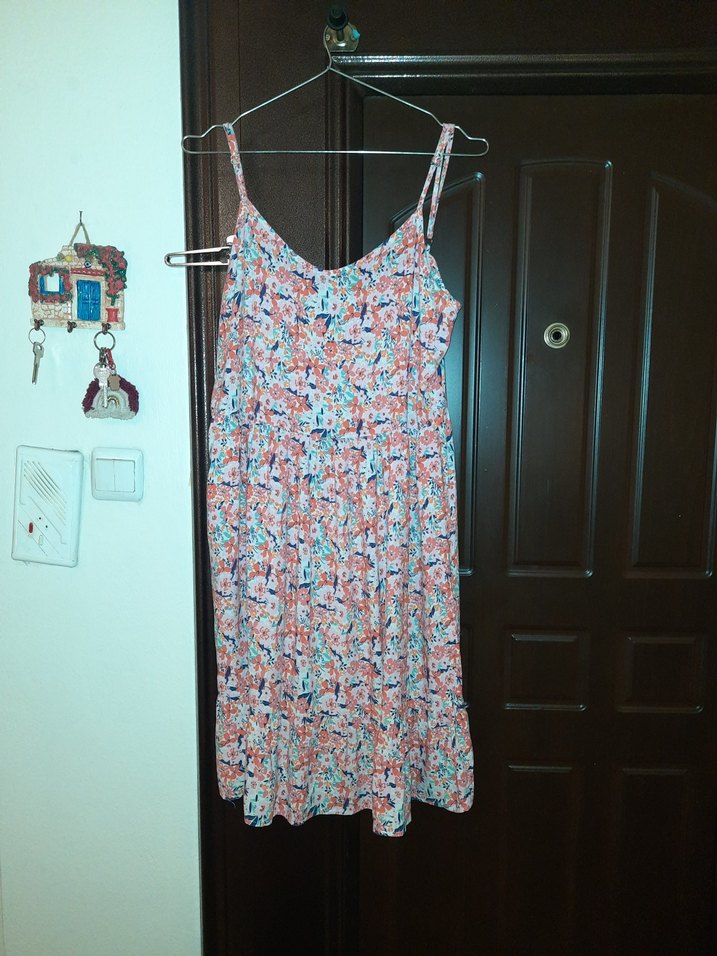 Askılı, bol kesim desenli midi elbise. max 2 kez giyildi zayifladigim icin artik olmuyor. hicbir defosu yoktur.