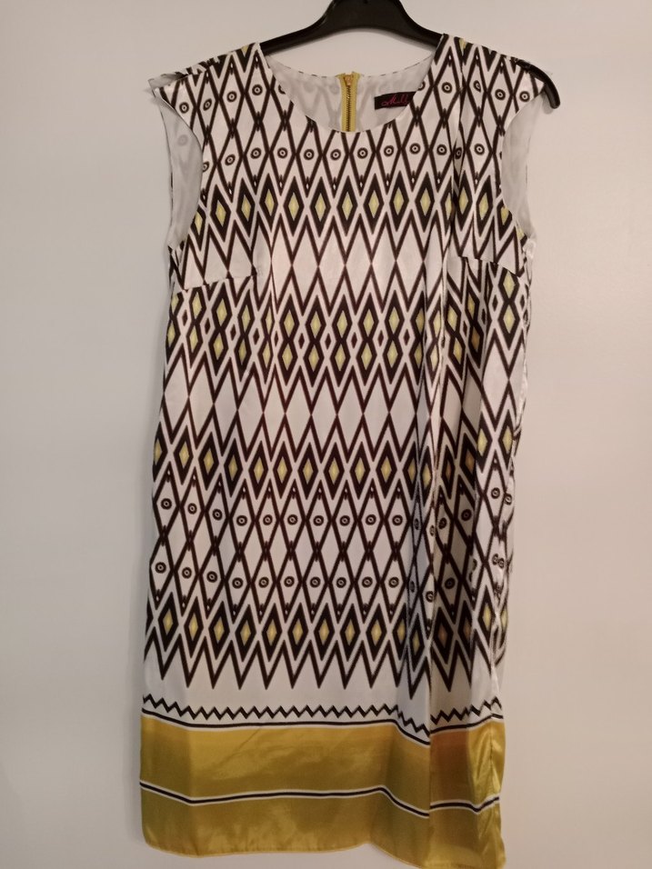 Süet görünümlü, bohem çok renkli, kolsuz midi elbise. Tekne yaka ve bol kesim, geometrik desenli, dökümlü tasarım.