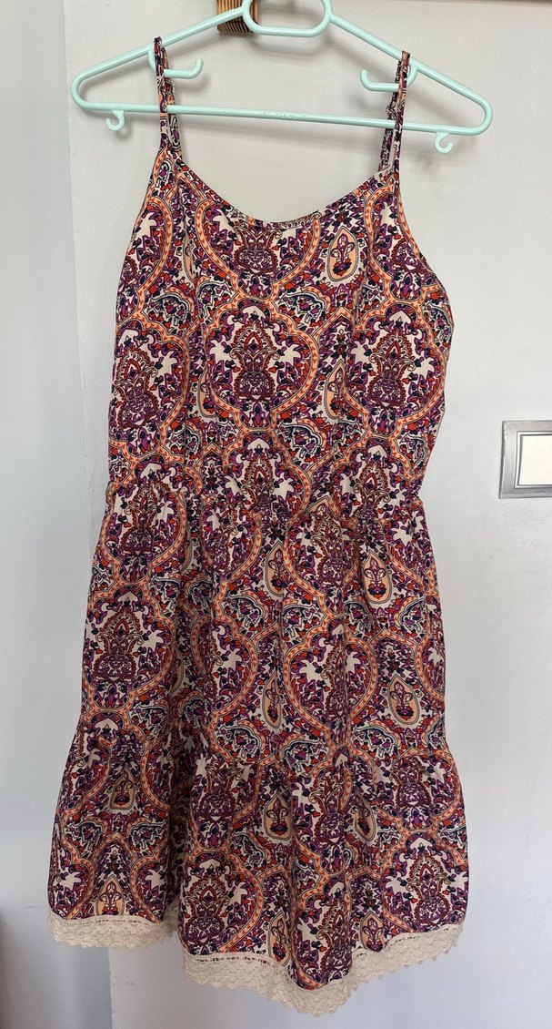 Kolsuz, yüksek yakalı ve dökümlü tasarıma sahip bol kesim midi elbise. Yumuşak sentetik kumaştan, koyu çok renkli bohem desenlidir. Günlük kullanım için uygun.