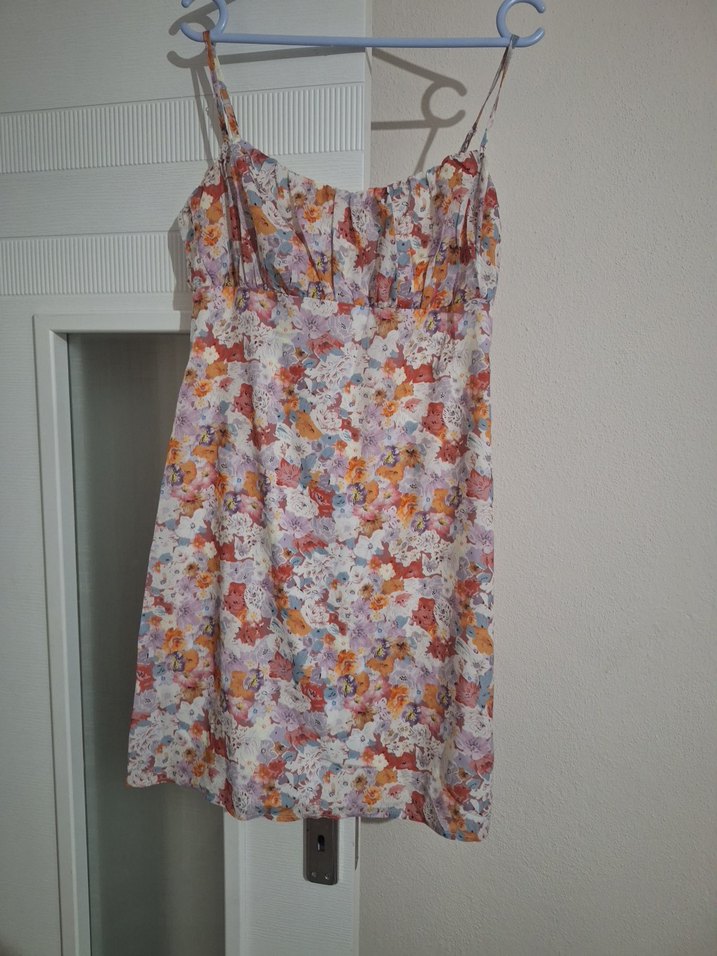 Sırtı askılı, drapeli ve vücuda oturan bu midi elbise, sentetik kumaştan yapılmıştır. Pastel tonlarda çok renkli batik deseni ile bohem tarzını yansıtır.
