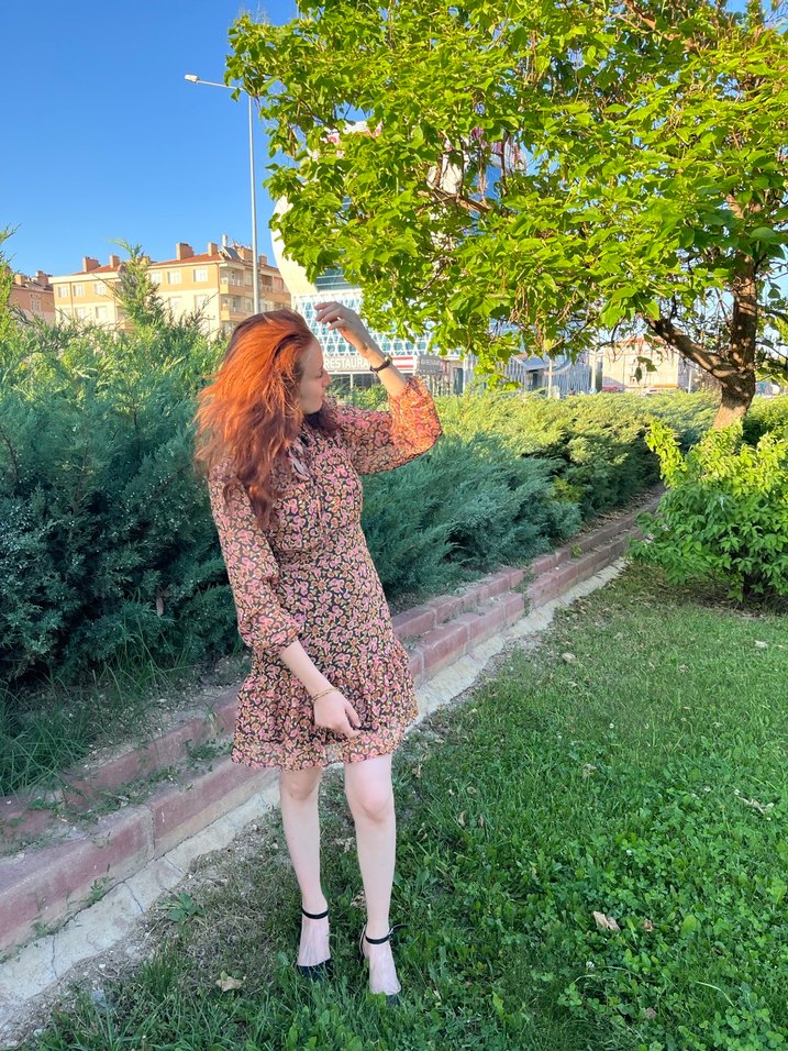 Pastel tonlarda çok renkli, uzun kollu, yakalı, bol kesim midi elbise. Hafif sentetik kumaştan, dış mekan kullanımı için uygun.