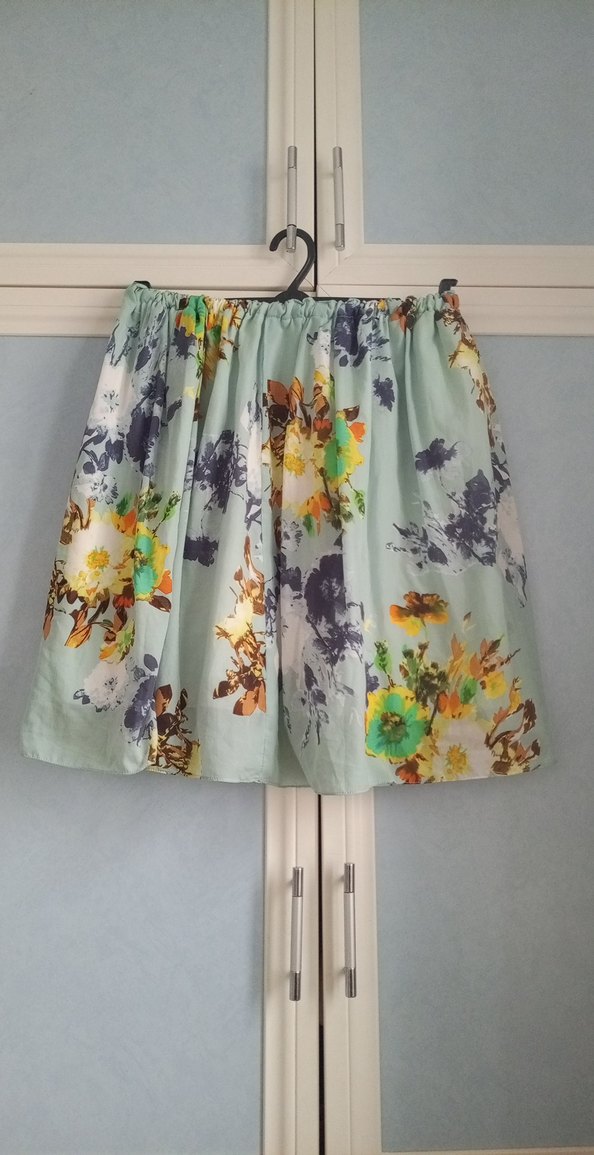Bohem tarzda, çok renkli tie-dye desenli, bol kesim ve drapeli midi eteği.