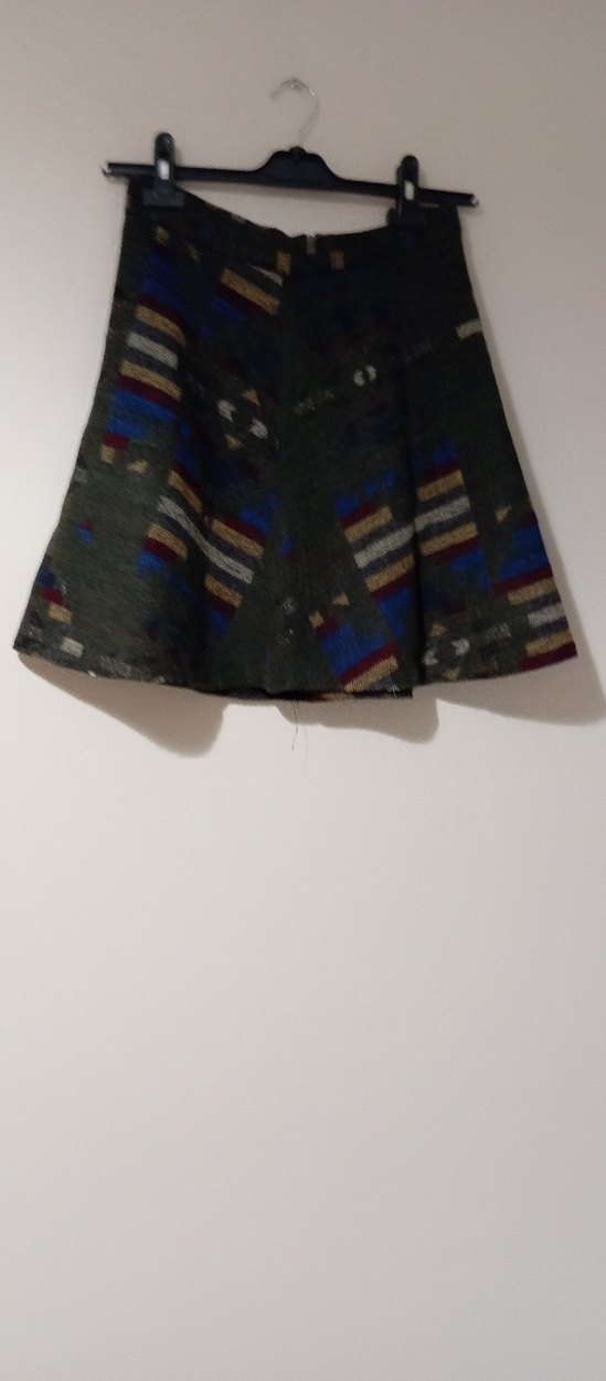 Bohem tarzda, bol kesim ve drapeli çok renkli, koyu tonlarda batik desenli midi hamile eteği.