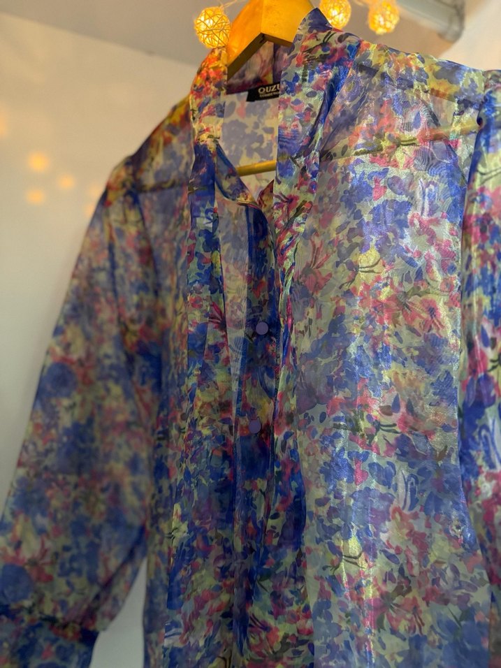 Bohem tarzda, düğmeli, yakalı, uzun kollu, midi boy, çok renkli pastel tonlarda, hafif ve ipeksi dokulu bol kesim gömlek.