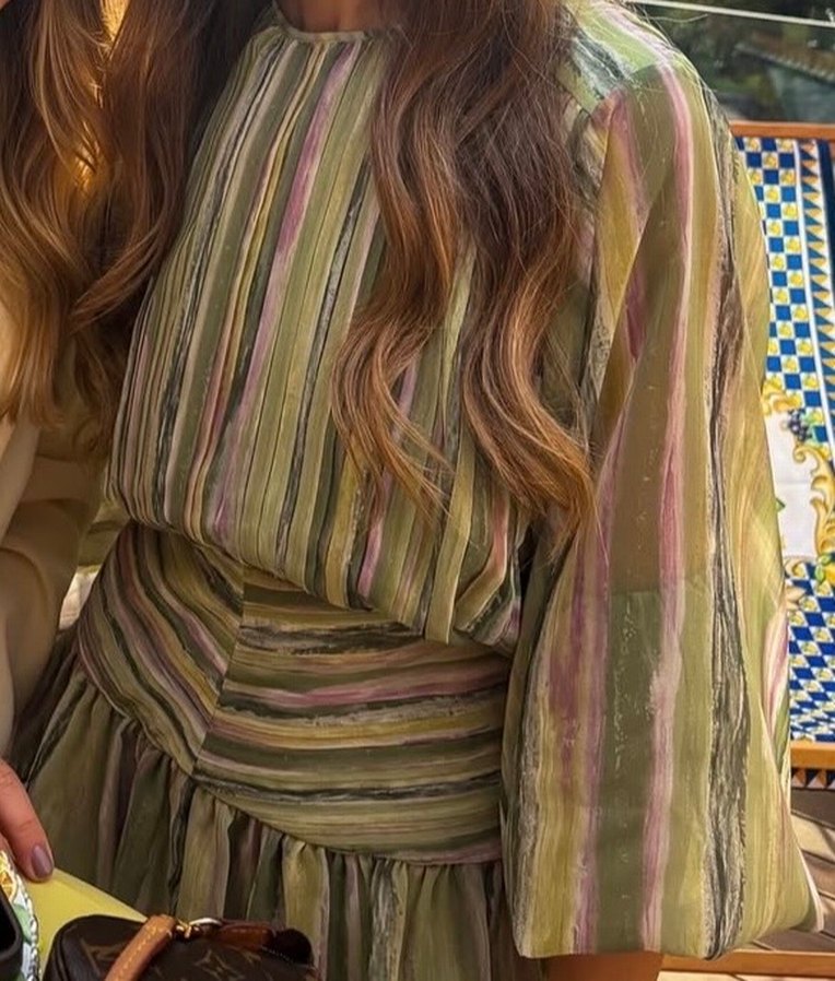 Bohem tarzda, uzun kollu ve yüksek yakalı, pileli kat kat etekli mini elbise. Pastel tonlarda çok renkli batik desenli, hafif sentetik kumaştan, bol kesim. Parti için uygun.