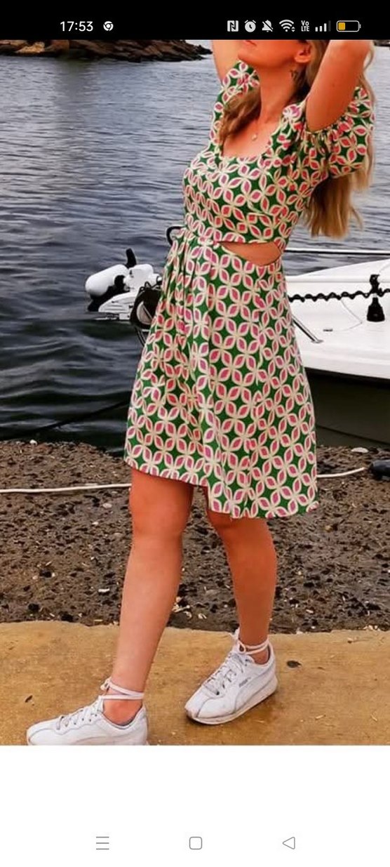 Bohem tarzda, bel kemerli, askılı kollu ve V yaka mini elbise. Pastel tonlarda çok renkli batik desenli, tekstil kumaştan, dış mekan kullanımı için uygun.